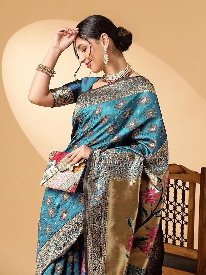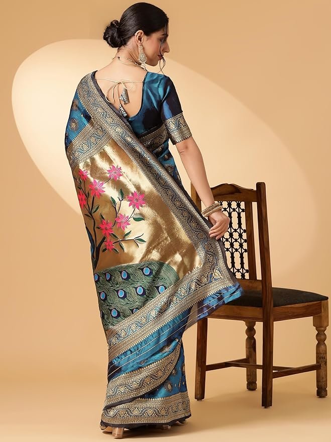 • Saree Details || Saree Fabric :- Silk Blend| Saree Pattern :-Woven Design |Saree Length :- 5.3 Meter | Saree Type :- Paithani | Saree Color : Sky